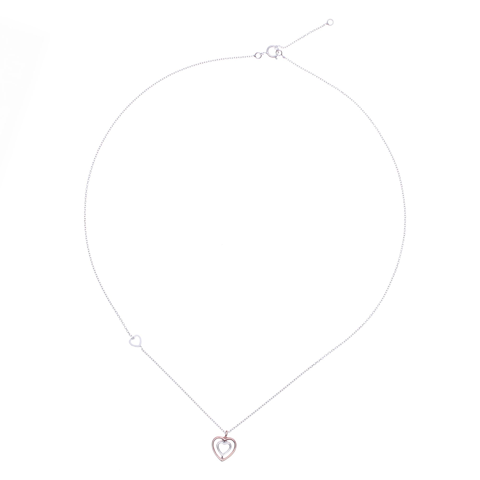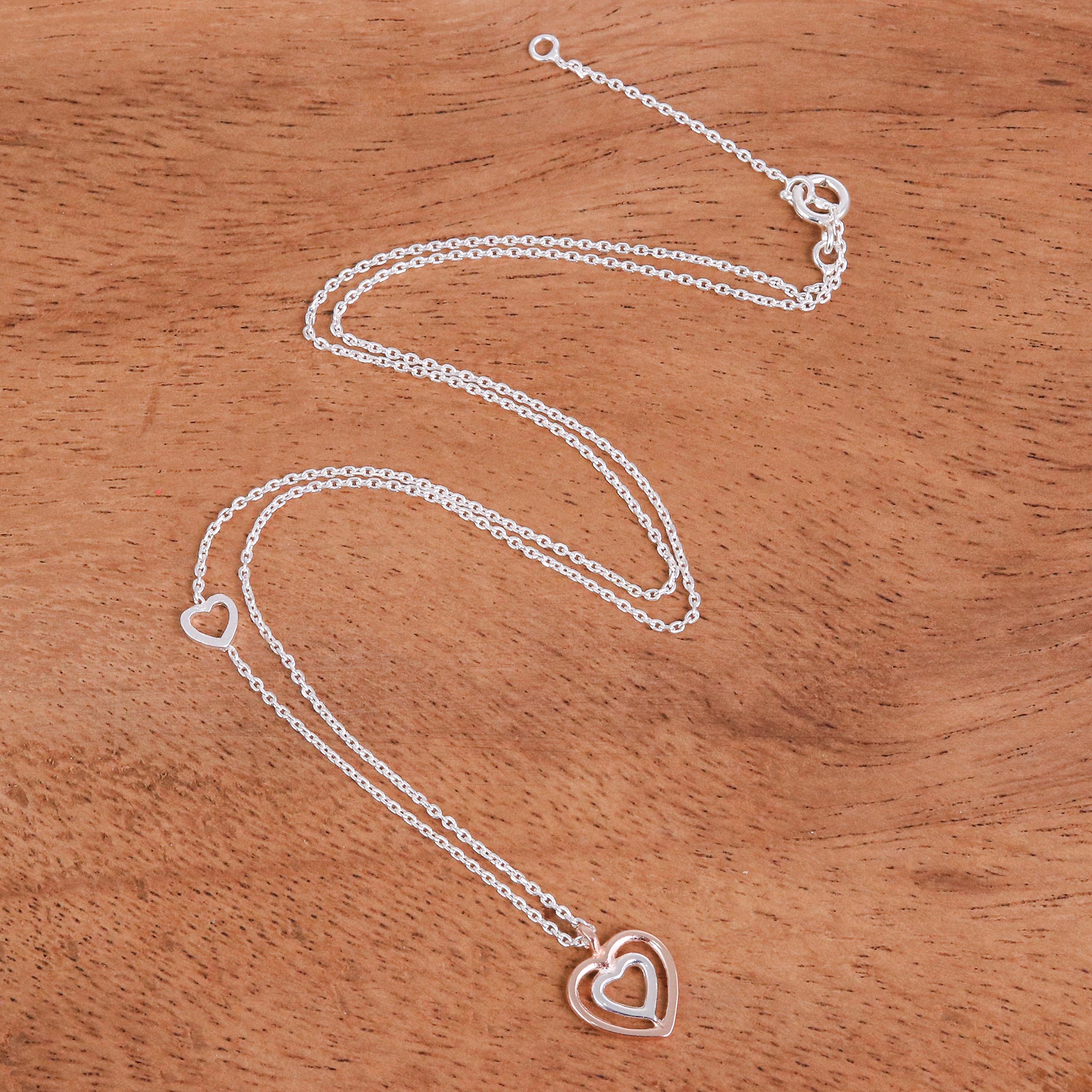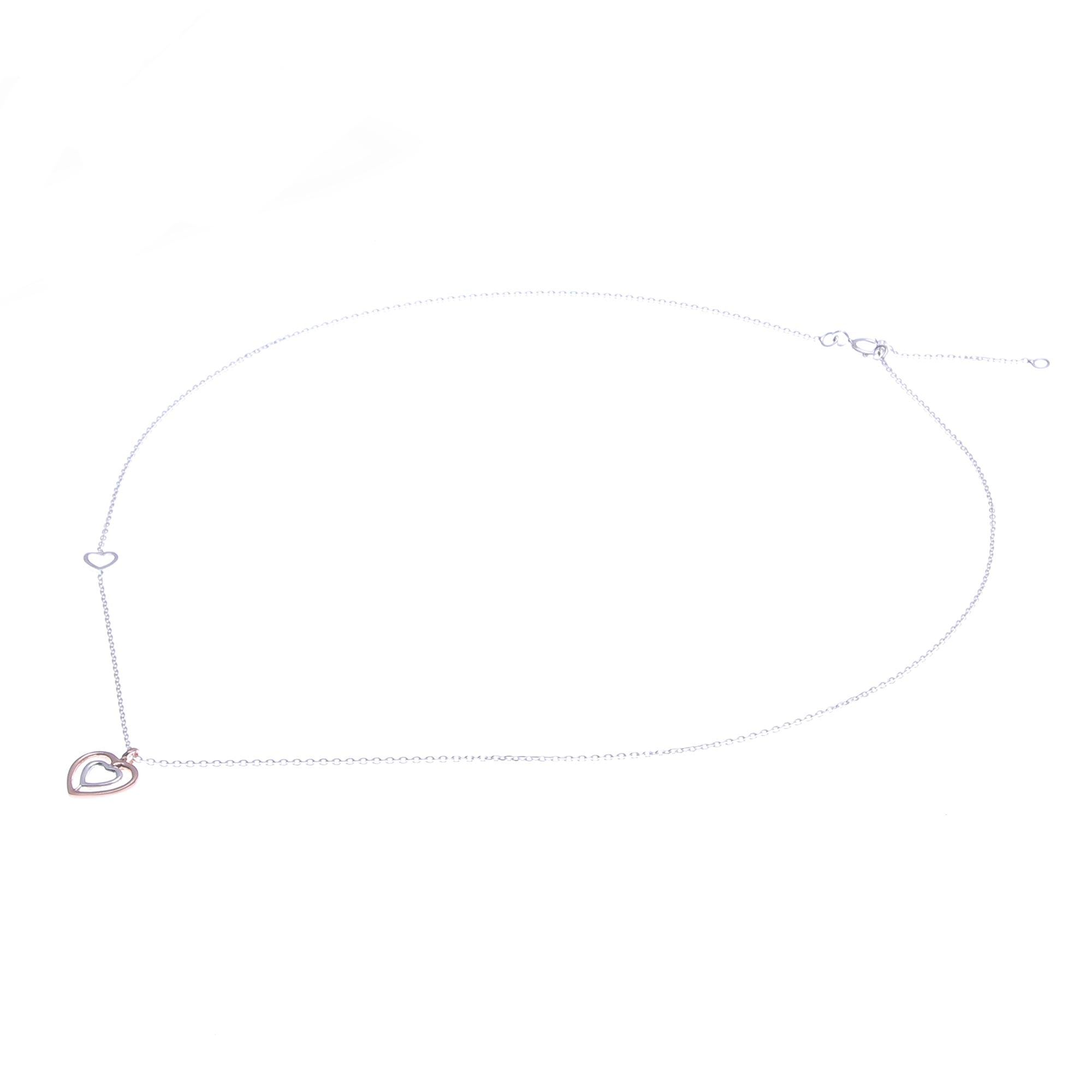 Perfect for the hopeless romantic, this necklace is designed by Pornsit Mayuraks in Thailand. Crafted from gleaming sterling silver, the necklace features a double heart pendant partially plated in 14k rose gold. An additional sterling heart adorns the cable chain.