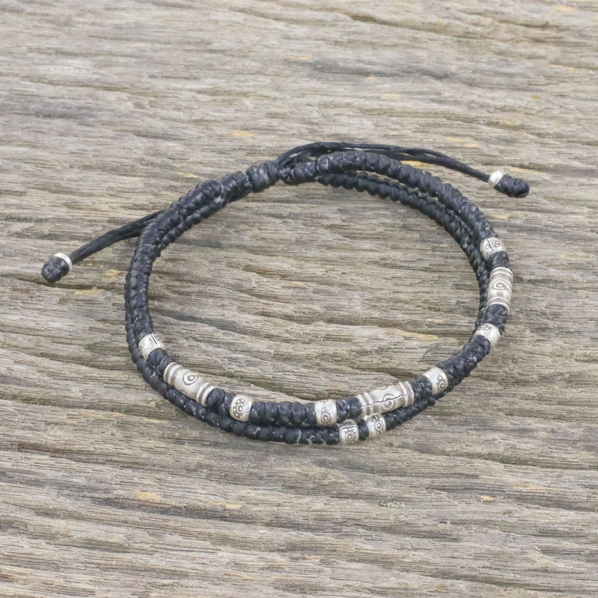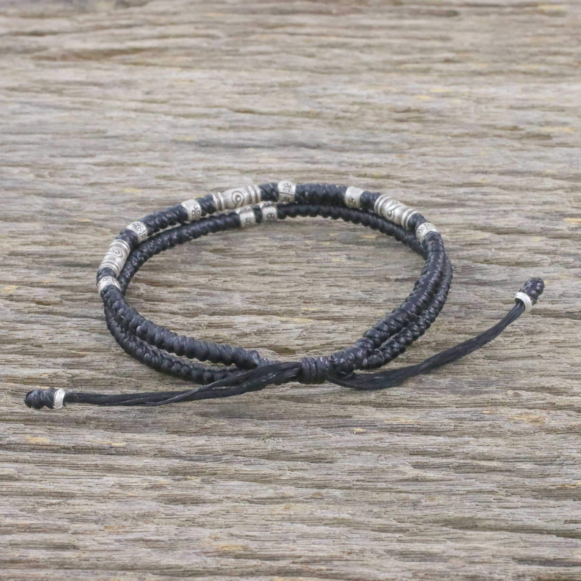 Napapat of Thailand crafts a stylish bracelet that features double braided black cords of waxed polyester. The two cords are punctuated with Karen hill tribe 950 silver beads at different intervals. The oxidized silver beads bear the unique stamped motifs that are traditional to the Thai hill tribes. A sliding knot allows you to adjust the bracelet to the desired length.