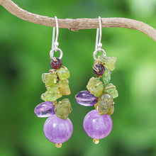 A glowing purple orb hangs from a cluster of colorful gemstones on Nareerat's captivating dangle earrings. The Thai artisan hand knots shimmering golden thread around peridot chips, garnet globes, and quartz beads to create each earring, suspending a round amethyst below. Finally, sterling silver hooks over the pair a bit of shine.