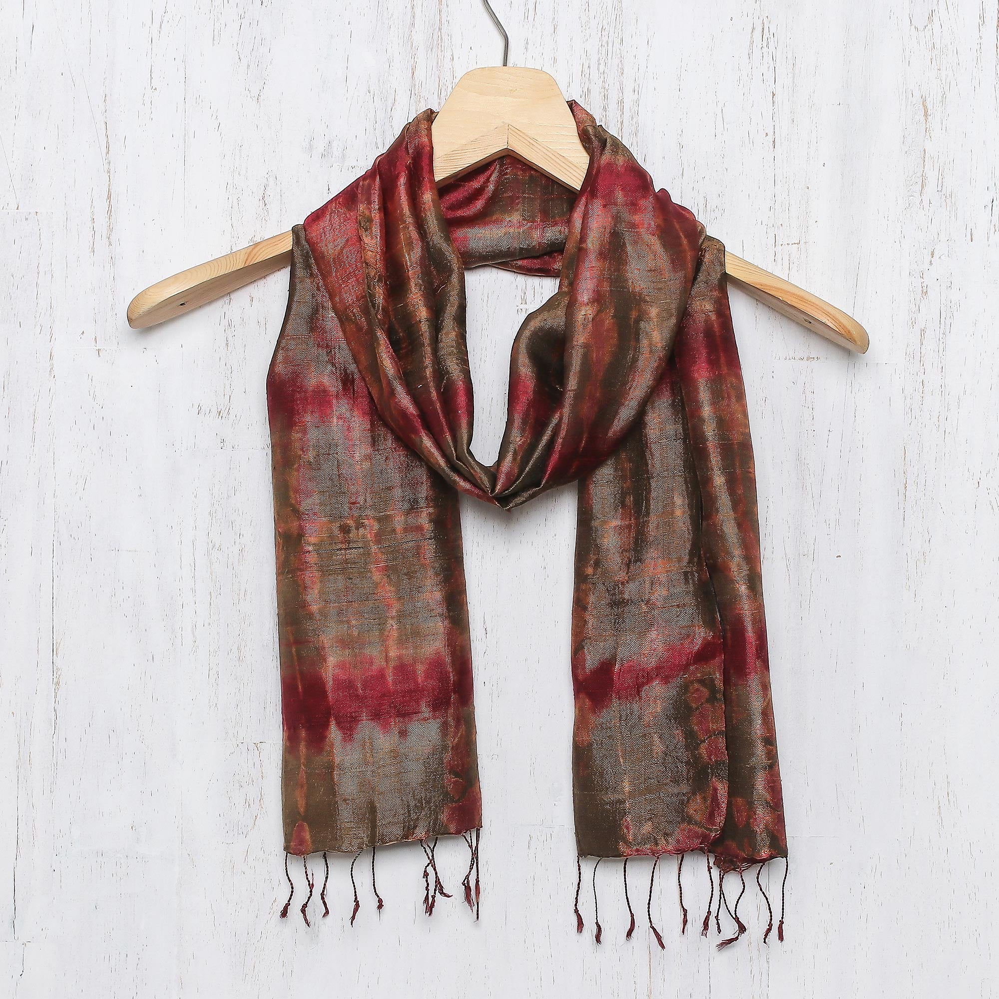 Tie-dyeing this silk scarf with the claret and avocado colors of a macaw parrot, Thai artisan Vinita creates a truly lovely accessory. It wraps the neck with elegant, finished at each end with delicate fringes.