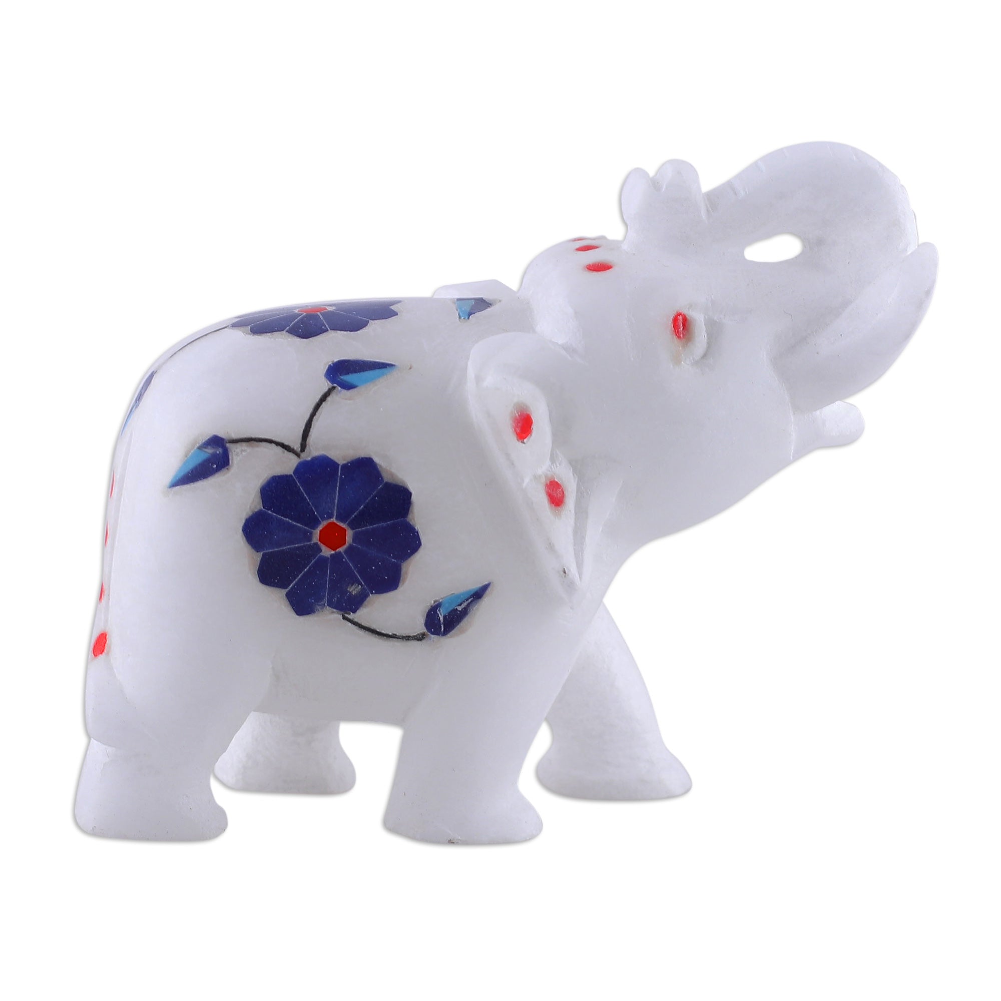 Blue blooms carved on refined alabaster open the door to a regal world. Artisan Sanjay Garg of India hand-carves this elephant figurine with traditional techniques, adding floral details that decorate the piece with spring's mystic aura.