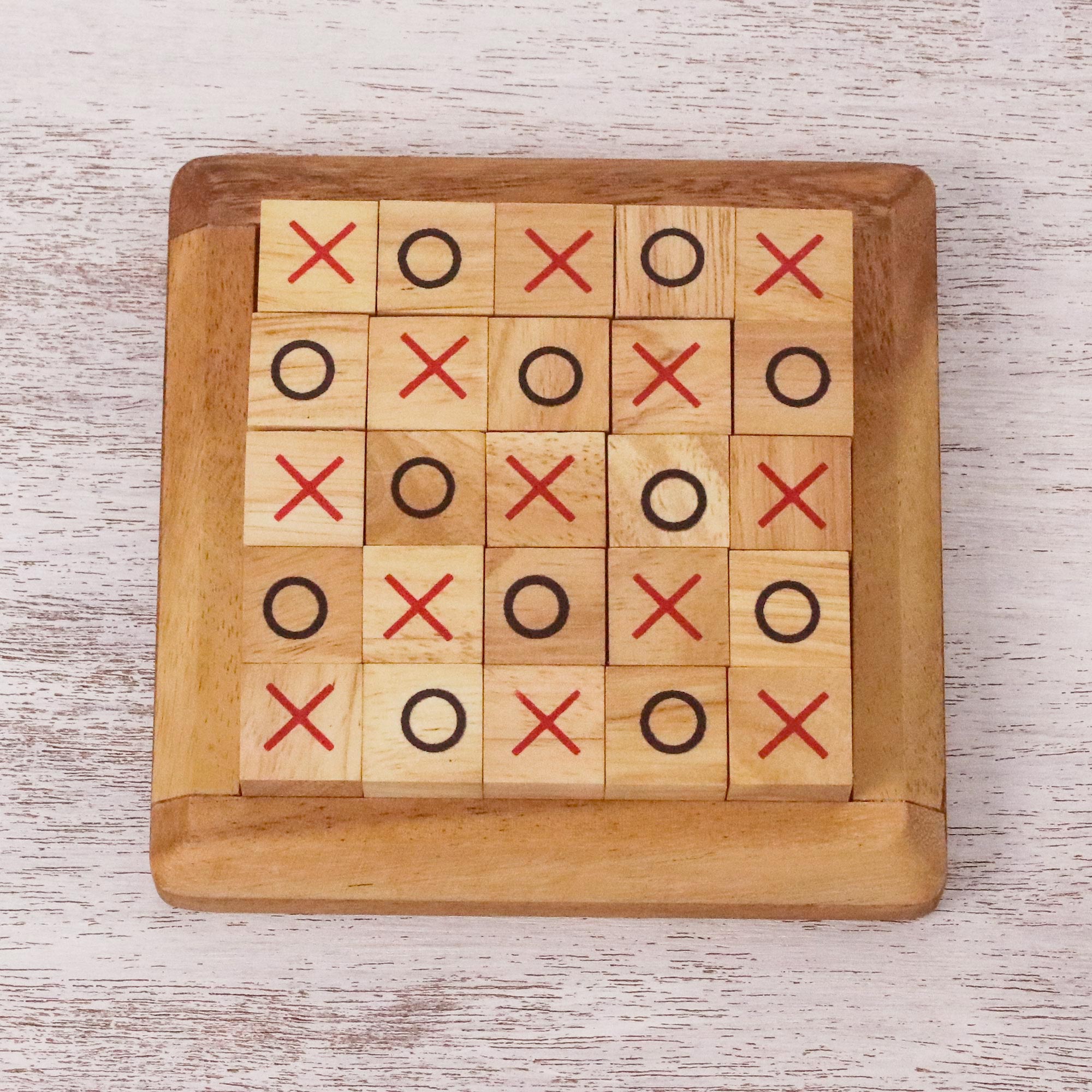 Presenting an extreme version of the classic tic-tac-toe game, this board features 25 individual spaces on the play field. Designed by Thai artisan Waraporn Khamsuk, this tic-tac-toe board is crafted of raintree wood and rubberwood, including a square base and 25 cubes with X and O symbols on them. According to the artisan, tic-tac-toe can be modified on this board to play for three, four, or five in a row.