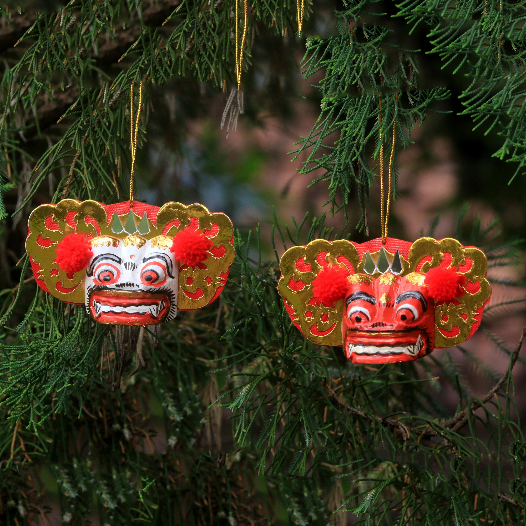 These handmade ornaments from artisan Komang Sri depict Barong, a mythical creature from Balinese folklore. While Barong can be depicted in a variety of forms, here the artisan has given the Barong's face a humanistic expression and sharp teeth. The ornaments are carved from albesia wood, one painted white and the other red, with gold paper accents and red pompoms adding a festive touch.