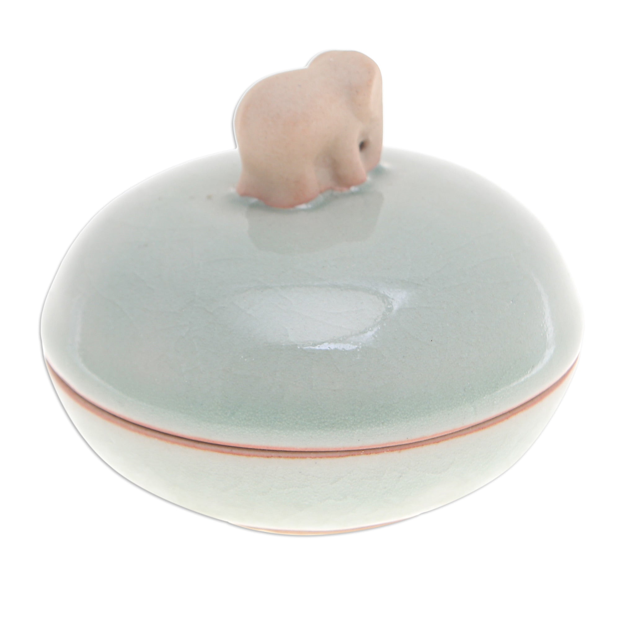 Gracefully adorning the lid of a ceramic jar, a delightful elephant with abstract features assumes the role of a handle. This exquisite design by Thailand’s Penpan is handcrafted using the time-honored celadon ceramic technique. The result is a remarkable crackled finish and a distinctive green glaze that instantly captures attention. This remarkable accessory serves as an ideal sanctuary for safeguarding cherished trinkets or as an exquisite decorative accent, adding a touch of elegance to any space.